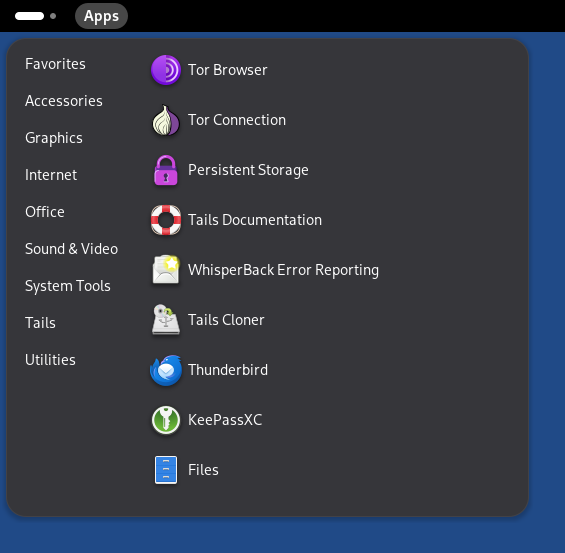 Окружение рабочего стола в Tails называется GNOME. Здесь мы расскажем о некоторых важных особенностях рабочего стола, связанных с Tails.