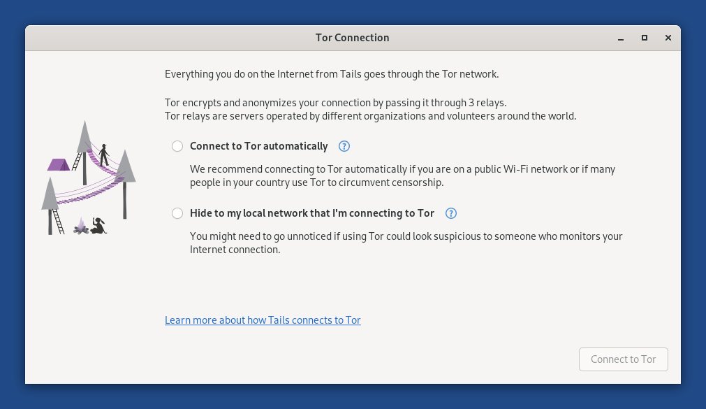 After establishing a connection to a local network, the Tor Connection assistant appears to help you connect to the Tor network.